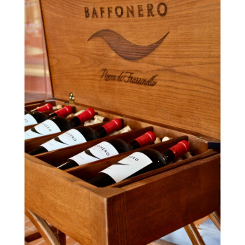 The Baffonero console is an elegant solid wood package designed to accommodate 6 1.5L Magnum bottles of the current vintage. The individual compartments enhance each bottle, while the branded lid adds a touch of sophistication. The clean design and the flap opening make it ideal as a furnishing element suitable for different environments. An ideal object to enhance the iconic wine of Rocca di Frassinello with style and prestige.