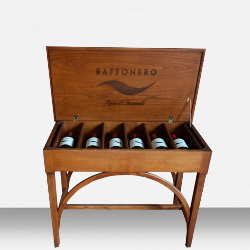 La consolle in legno di noce massello contiene 6 bottiglie di Baffonero (annata corrente) del formato Magnum da 1,5 l.